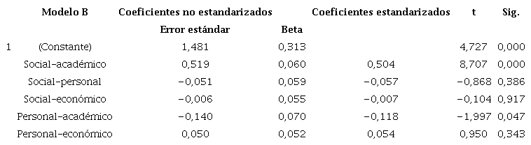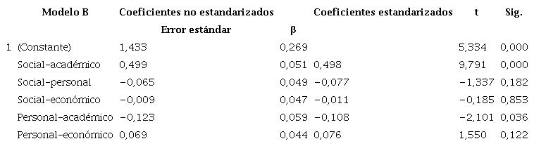 Tras la realización del análisis factorial, se han calculado las medias de cada una de las dimensiones, con las que, según los valores obtenidos, el alumnado muestra distintos grados de conformidad. Así, mientras que el alumnado parece atribuir mayor relevancia a los factores “social-personal” (M = 3,25, DE = 1,125), “personal-económico” (M = 3,22, DE = 1,067) y “personal-social” (M = 3,13, DE = 0,992), el resto de factores “social-académico” (M=2,64, DE=0,959), “social-económico” (M = 2,32, DE = 1,182) y “personal-académico” (M = 2,04, DE = 0,845) reciben calificaciones inferiores al valor medio de la escala Likert empleada.