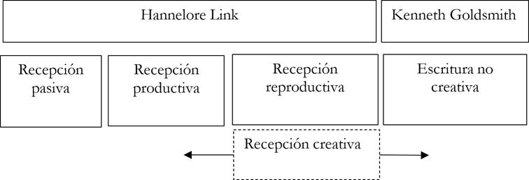 Si, a la hora de clasificar a grandes rasgos los modos de recepción de las obras literarias, partimos con Hannelore Link (1976) de una división entre recepción pasiva -el consumo silencioso de literatura que no deja testimonio documental alguno-, recepción reproductiva -materializada en reseñas, críticas, comentarios, cartas, apuntes, glosas que orbitan en torno a una obra base- y recepción productiva -la agenciada por creadores propiamente dichos, que, bajo la figura de la influencia del objeto recibido, crean una nueva obra de arte- (también Moog-Grünewald, 1984, pp. 81-82), la recepción creativa se situaría dentro de la dimensión reproductiva, pero particularmente en la zona limítrofe con la dimensión productiva.