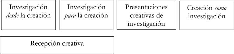 Con el fin de situar más claramente la recepción creativa, nos valemos de la taxonomía que Chapman y Sawchuk (2012) proponen y que depende de los diferentes modos en que la investigación y la creación pueden articularse: en primer lugar, en la “investigación para la creación” (research-for-creation), la relación entre ambos momentos se caracteriza porque la investigación se pone al servicio de la creación, al modo de revisiones de literatura, búsqueda de antecedentes que se relacionan con la práctica creativa que se pretende llevar a cabo, construcción de un marco conceptual, etc. Se trata de un proceso investigativo con fases concretas para la posterior creación de algún producto.