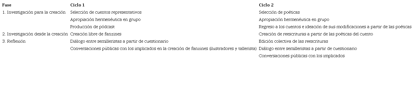 En la Tabla 1 se sintetizan las fases y los ciclos de la recepción creativa en la experiencia del semillero.