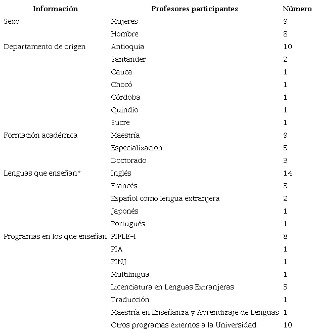 Los participantes en este proyecto fueron 17 profesores de lenguas extranjeras de diferentes programas de la Escuela de Idiomas, con trayectorias académicas y profesionales bastante diversas. La mayoría son originarios de la región andina, principalmente de Antioquia, y algunos provienen de las regiones atlántica y pacífica; para todos ellos, el español es su lengua materna.