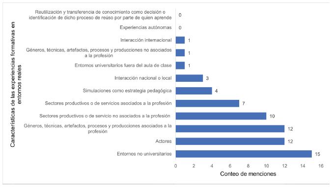 Finalmente, las “experiencias formativas en entonos reales” se definieron como una amplia gama de experiencias vividas a lo largo del plan de estudios, incluyendo las prácticas profesionales y las pasantías u otras prácticas preprofesionales, que se gestionan en entornos reales (Zabalza Beraza, 2016); es decir, incluyen otros escenarios y actores, además de la experiencia de aula, entendida como la diada profesores y alumnos. En este sentido, estas prácticas se relacionan con enfoques de aprendizaje experiencial (Morris, 2019).