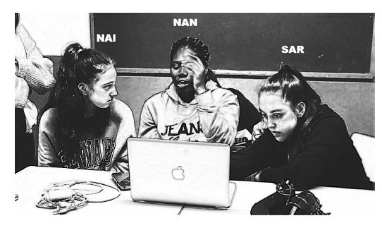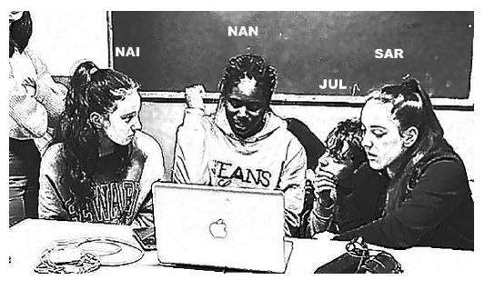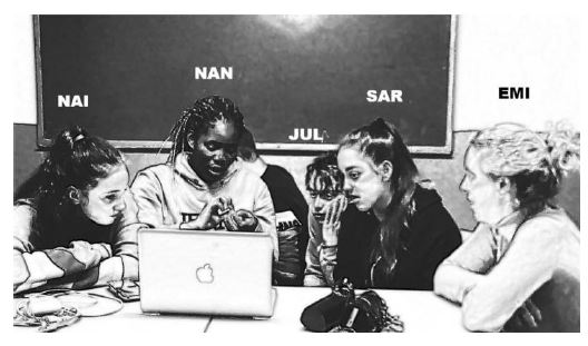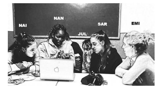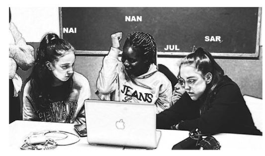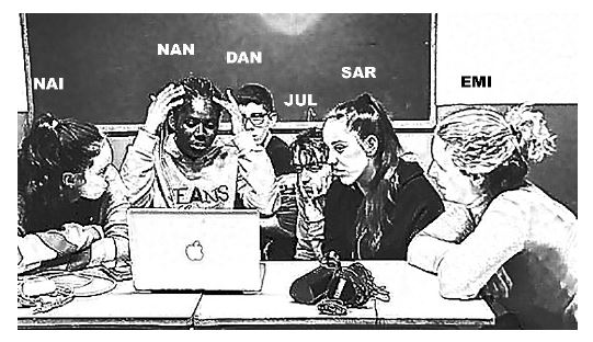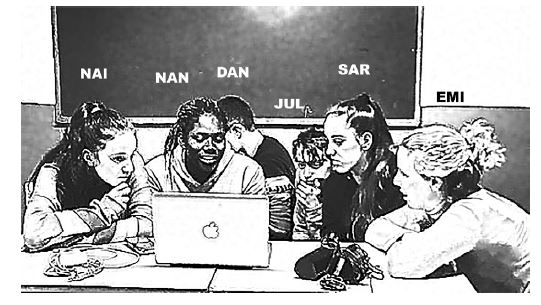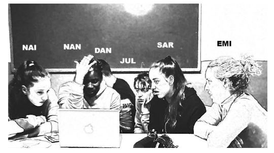 The participants named in the transcription and who are visible in the screenshot from the video recording (Figure 1) are, from left to right, NAI: Naiara (pseudonym, youth participant); NAN: Nanyamka (pseudonym, youth participant); DAN: Daniel (pseudonym, youth part-icipant); JUL: Julián (pseudonym, youth participant); SAR: Sara (pseudonym, youth participant); EMI: Emilee (a facilitator/researcher). CLA: Claudia (a facilitator/researcher) also participates in the interaction but is not in the camera view. Miaomiao (a facilitator/researcher/author of this article) is also present but does not verbally participate in this interaction.