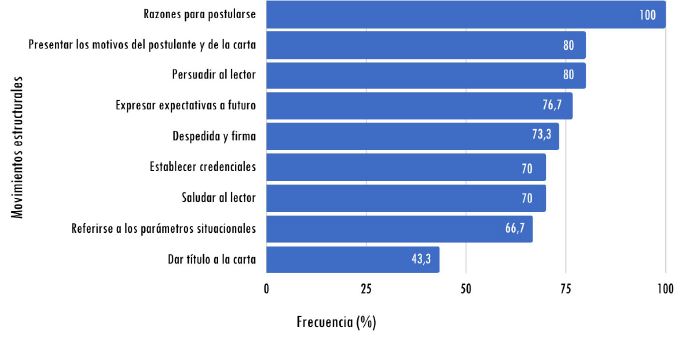 Como indicamos, los postulantes no recibieron instrucciones sobre la extensión de la carta, la estructura, ni las características generales del contenido, a excepción de la manifestación explícita de comprometerse a ser estudiantes de tiempo completo en caso de ser aceptados en el programa. Por supuesto, esto implica que hay variaciones en el contenido de las cartas, puesto que no todos los postulantes utilizaron todos los movimientos ni en el mismo orden, como se observa en la Figura 1.