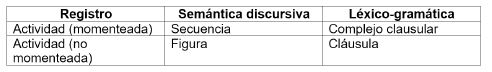 La Figura 1 muestra las correlaciones “no marcadas” entre las unidades ideacionales mencionadas, correspondientes al registro, la semántica discursiva y la léxico-gramática.