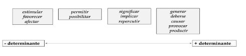 En este trabajo se postula que las MGL en la forma de grupos verbales pueden expresar diferentes grados de causalidad. Frente al limitado rango de significados causales que permiten las conjunciones, el amplio sistema de Procesos disponibles entrega a los historiadores los recursos requeridos para explicar con mayor delicadeza o detalle cómo un evento lleva a otro y establecer tipos diferenciados de relaciones de causa-efecto. Se ha descrito que las elecciones léxicas de cada grupo verbal manifiestan distintos grados de “fuerza causal” (Coffin, 2004; Leiva, en prensa; Martin, 2003), que pueden ordenarse de menos a más determinantes. Mientras Procesos como “generar” y “causar” realizan una causalidad determinante, otros como “estimular” y “favorecer” relativizan el vínculo causal y lo muestran menos determinante. Estas opciones son presentadas en la Figura 2.
