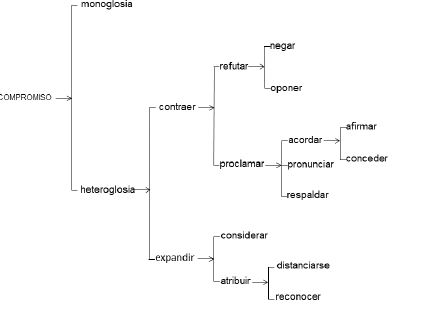 En el análisis de las MGL, resultan relevantes los significados de COMPROMISO. Este subsistema permite dar cuenta de la negociación interpersonal de las fuentes de las actitudes (Martin y White, 2005; White, 2010, 2012). Esta construcción intersubjetiva entre autores y receptores potenciales puede tomar una orientación monoglósica, lo que implica el no reconocimiento de voces alternativas por parte de la voz autoral, o una orientación heteroglósica, lo que supone un reconocimiento en diferentes grados de voces alternativas a la voz autoral en un texto. Las posiciones más o menos heteroglósicas pueden realizarse en un amplio espectro de estructuras léxico-gramaticales, que varían según los tipos de género, registro y lengua. De acuerdo con Martin y White (2005), las opciones heteroglósicas pueden ser de contracción o de expansión dialógica, y pueden organizarse en mayor delicadeza como opciones de [refutar], [proclamar], [considerar] y [atribuir]. Estas opciones de COMPROMISO se muestran en la Figura 3.