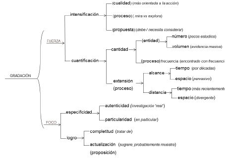 También es relevante para el análisis de las MGL el ensamble del significado causal con significados de GRADACIÓN. Este sistema se asocia a la metafunción interpersonal, dado que aborda la evaluación subjetiva del significado en términos de grados y no en términos de distinciones categoriales, asociadas a la metafunción ideacional (Hood y Martin, 2007). De acuerdo con el subsistema descrito inicialmente para el inglés, es posible graduar tanto los significados evaluativos como los experienciales.