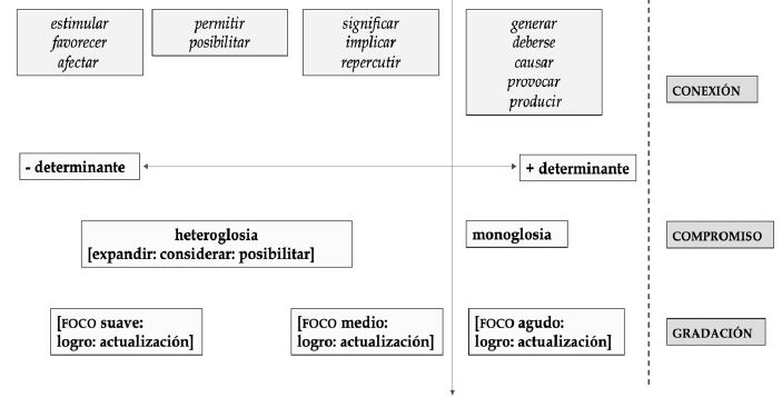 Como se presenta en el apartado “Resultados y discusión”, el ensamble de significados de CONEXIÓN causal realizados a través de Procesos como MGL se produce con significados de monoglosia y heteroglosia. En efecto, postulamos que las distintas opciones léxicas que realizan una conexión causal entre figuras pueden cerrar o bien abrir y expandir el espacio a posiciones alternativas en el discurso. Identificamos particularmente orientaciones monoglósicas y orientaciones heteroglósicas de expansión dialógica [expandir: considerar].