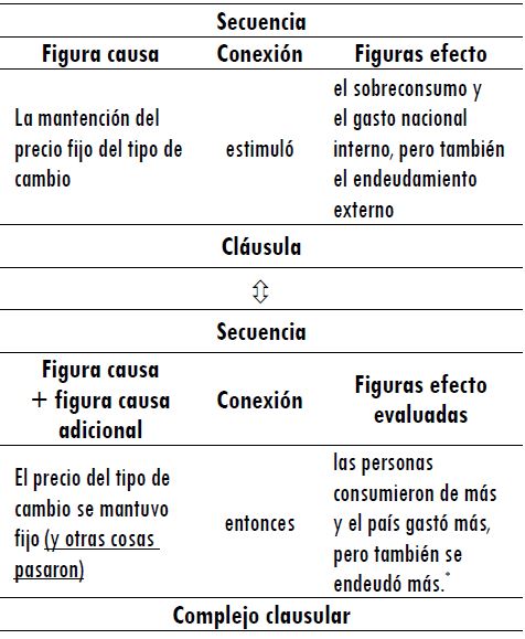 La secuencia destacada en el Ejemplo 11 también presenta una causalidad habilitante. Mediante el Proceso “estimuló”, se relaciona causalmente el hecho de que el precio del tipo de cambio se mantuviera fijo, por un lado, y que las personas consumieran de más y el país gastara más y se endeudara, por otro.