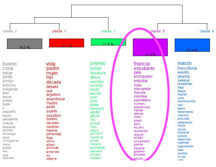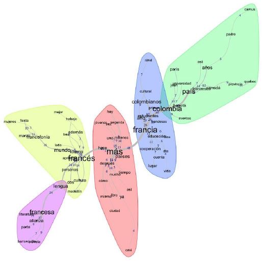 Avant toute chose, il est possible de repérer que les noyaux du graphique se subdivisent en six mots-axes, à savoir francés (français), más (plus), Francia (France) et, enfin, Colombia (Colombie) avec le plus grand nombre d’occurrences. Ceux-ci sont suivis par les unités faisant référence aux mots país (pays) et francesa (française), cette dernière étant le plus souvent associée à lengua (langue), literatura (littérature) et Alianza (Alliance). Or, si on regarde de près chaque unité lexicale, il est possible de soulever certaines pistes quant aux imaginaires locaux de francophonie élaborés par la presse écrite.