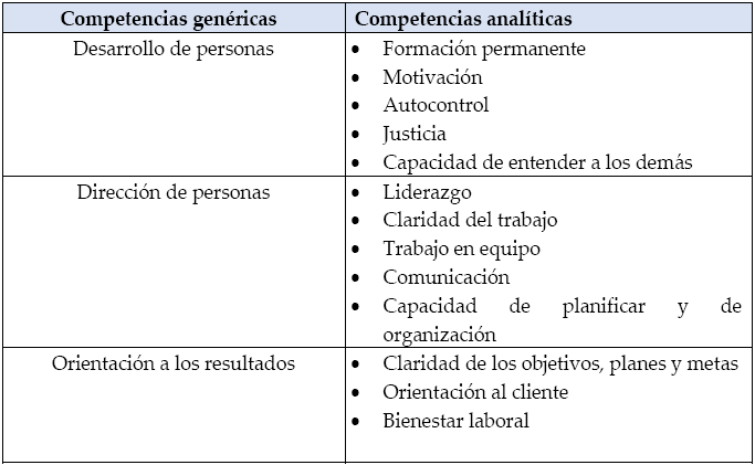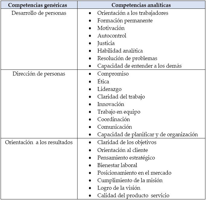 Partiendo de las clasificaciones estudiadas la investigación estableció tres competencias genéricas: La primera el desarrollo de personas, entendida como la capacidad de incrementar los niveles de conocimiento y experticia de los trabajadores mediante la formación, motivación y el crecimiento individual. La segunda la dirección de personas definida como la capacidad lograr eficientemente los objetivos desempeñando sus actividades laborales mediante el trabajo en equipo, y finalmente la orientación a los resultados que no es más que el desarrollo de un pensamiento estratégico, innovando y aportando ideas que garanticen el crecimiento y sostenibilidad organizacional.