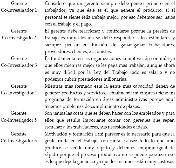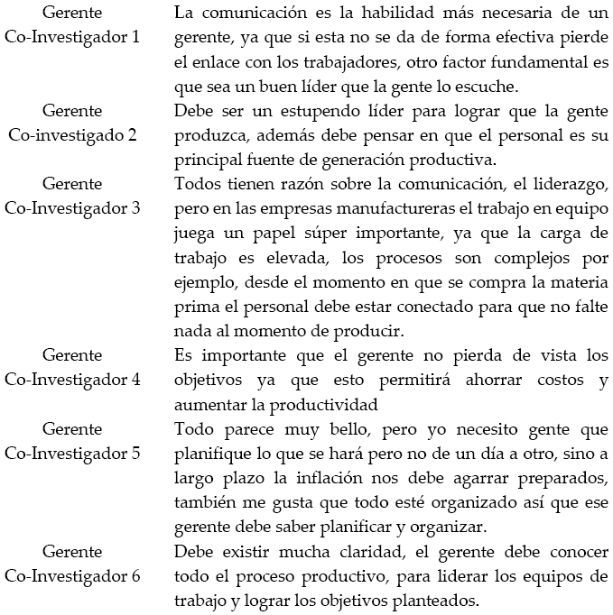 En el caso particular de la investigación fueron los gerentes de las empresas del sector manufacturero los co-investigadores, esto permitió que cada gerente expresara sus opiniones respecto al desempeño gerencial y a las competencias gerenciales que deben tener los gerentes para hacer frente a los objetivos organizacionales, convirtiéndose así en los desarrolladores directos de la investigación conjuntamente con la investigadora.