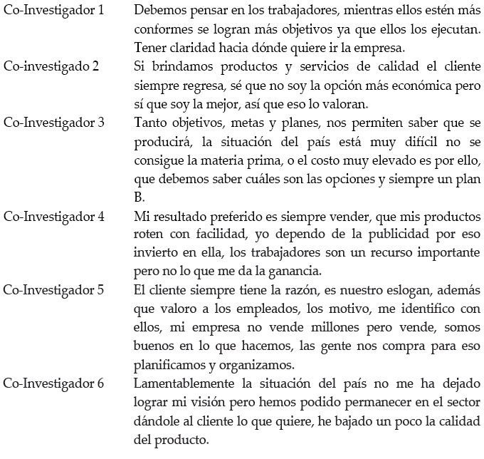 En su totalidad todos los co-investigadores consideran que lo más importante para lograr resultados en una organización es poder cumplir con metas y objetivos en los tiempos establecidos, con el menor recurso posible, cabe resaltar que dichos resultados deben satisfacer la necesidad de los clientes lo cual generará: Incremento de las ventas, aceptación de los productos, visibilidad. El co-investigador 2 manifestó puntualmente que la empresa debe tener objetivos para la empresa y para el personal, eso motiva a la gente a trabajar más y mejor.