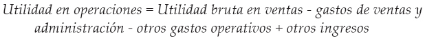 En otras palabras, la utilidad en operaciones, como indicador, es el término que representa las actividades propias del negocio, el desempeño y la gestión de la entidad durante el despliegue de su misión y propósito, en un periodo determinado, donde el costo de ventas representa el proceso de fabricación de bienes o la prestación de servicios, mientras que los gastos de ventas y administrativos, y otros gastos operativos, miden los recursos utilizados en las actividades de apoyo para el logro de la misión de la compañía o el objetivo de colocar estos bienes y servicios en el mercado a disposición de los consumidores.