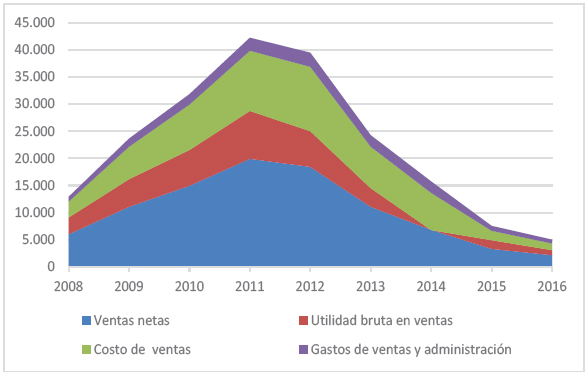 Combinando algunas variables de los cuadros 2, 3 y 6 se tiene el gráfico 1, el cual descubre el impacto que sobre las ventas netas tienen el costo de ventas y los gastos de ventas y administración, como principales elementos de reducción de la utilidad bruta en ventas, resultando una utilidad en operaciones disminuida de forma crítica de la empresa BBRY, para los años fiscales que van del 2008 al 2016.