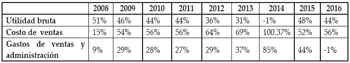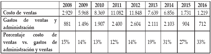 Indicadores como el costo de ventas y los gastos de ventas y administración se encuentran estrechamente relacionados y precisan el área del negocio donde se encuentran los problemas de desempeño. Si los problemas se ubican en la producción o la generación de servicios, estos serán registrados en el costo de ventas. Si las dificultades se concentran en las áreas de apoyo (ventas y administración), serán contabilizados en los gastos de ventas y administración. En el caso de BBRY, una comparación de estos elementos se muestra en el cuadro 5, incluida su proporción porcentual y la desviación de recursos hacia las actividades de apoyo, en detrimento de los recursos destinados a la producción y al negocio principal. Estos datos fueron tomados de RIM (2009), RIM (2010), RIM (2011), RIM (2012), BBRY (2013), BBRY, (2014), BBRY (2015) y BBRY (2016).
