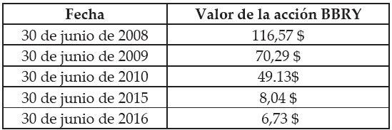 En el precio de la acción de la compañía se resumen los factores, positivos y negativos que inciden sobre la empresa y las expectativas futuras que el mercado tiene acerca de ella y su capacidad de mantenerse como empresa en marcha. A partir del año 2008 el precio de la acción de BBRY, inició un descenso que indicaba la incapacidad de la entidad para cumplir con su misión, tal como se muestra en el cuadro 7, según Nasdaq Index (2015a).