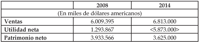 Seguidamente se muestra un comparativo para los años 2008 y 2014, donde se relacionan variables financieras, tales como las ventas, la utilidad neta y el patrimonio neto de la empresa (Ver cuadro 8), de acuerdo a la información aparecida en RIM (2009) y BBRY (2014), en los estados financieros de la compañía para los años en referencia. Es notoria la enorme pérdida sufrida por la corporación para el ejercicio fiscal 2014, que impide su crecimiento.