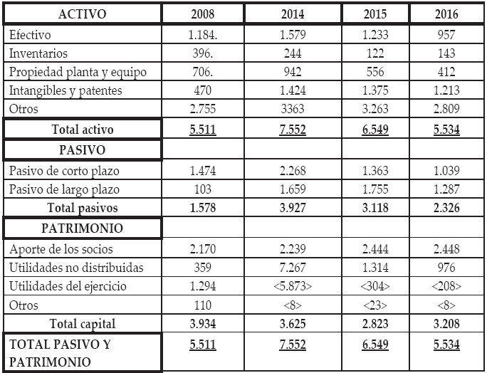 De acuerdo al planteamiento precedente, y con referencia a la capacidad instalada bajo el enfoque de la ecuación del patrimonio y su relación con las partidas contables, se muestra un resumen en el siguiente cuadro 9, tomando como base la estructura del estado de la situación financiera de BBRY, extraída de RIM (2009), páginas 49, 51 y 64 y de BBRY (2014), páginas 85 y 87, así como de los reportes BBRY (2015) y BBRY (2016). Únicamente, para este cuadro, se consideraron los periodos fiscales 2008, 2014, 2015 y 2016, debido a que son los que, en nuestra opinión, muestran los contrastes más relevantes. Con referencia al patrimonio, es importante señalar que para determinar la diferencia de los efectos anuales que sobre éste registraron las utilidades retenidas, les fue segregada la utilidad neta del ejercicio y presentadas separadamente en cada año.