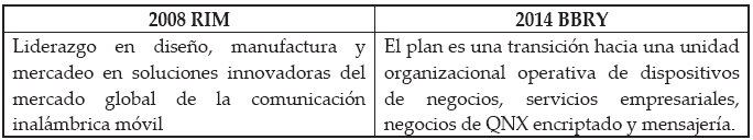 Reserch In Motion (RIM), posteriormente denominada BlackBerry, permitió mostrar resultados concretos, al analizar algunas de las variables pertinentes, debido al desempeño negativo de su misión, que generó pérdidas operativas lo suficientemente grandes que la colocaron en una situación de bancarrota y afectaron, significativamente, la venta de sus teléfonos inteligentes a nivel mundial. También se incluyen reseñas periodísticas como seguimiento al caso RIM, opiniones de algunos directivos y analistas externos.