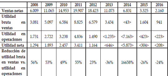 De RIM (2009) y BBRY (2016), respectivamente, se obtienen los indicadores mostrados en el cuadro 2, el cual detalla a las ventas netas, la utilidad bruta en ventas, la utilidad en operaciones y utilidad neta para el lapso comprendido entre los años 2008 y el 2016, así como la relación porcentual entre la utilidad bruta en ventas y la utilidad en operaciones