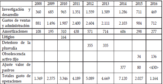 El cuadro 3 muestra los gastos de operaciones, donde investigación y desarrollo y gastos de ventas y administración consumen un alto porcentaje de los recursos disponibles, lo que determina la no alineación las actividades de la empresa.