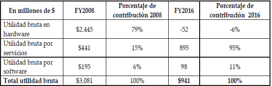 La reducción de la utilidad bruta, comparando los ejercicios 2008 y 2016, mostrados en el cuadro 4, cambió las proporciones de contribución por tipo de productos vendidos o servicios prestado, de acuerdo a RIM (2009) y BBRY. (2016), que determinaron el cambio de la misión de la corporación, verificándose de esta manera el punto central del presente artículo.