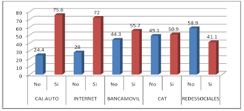 ¿Cuáles medios electrónicos bancarios conoce?. Pregunta de opción múltiple cuyos resultados muestran a cajeros automáticos y servicio online como los más conocidos al representar 75,6% y 72% respectivamente; le siguen la banca móvil 55,7%, centros de atención telefónica 50,9% y las redes sociales 41,1%. Es decir, los servicios son conocidos por los usuarios (Gráfico 1).