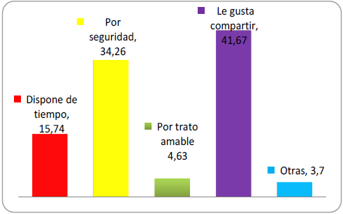 Acerca de las motivaciones para frecuentar las oficinas (opción múltiple), el Gráfico 10 muestra: El gusto por compartir (41,8%) y la seguridad (34,3%), motivan al usuario a acudir a las instalaciones bancarias, mientras que la disponibilidad de tiempo (15,7%), trato amable (4,6%) y otras (3,7%) presentan menores porcentajes. Este comportamiento es señalado por Barruta y Echebarria (2001), al apuntar que hay quienes les gusta el contacto cara a cara y pudiera reflejar un rasgo cultural del venezolano como es la afectividad y su orientación a las relaciones interpersonales (Granell, Garaway y Malpica, 1998).