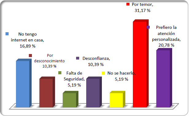 Motivos para no usar los medios electrónicos. El Gráfico 11 indica que la causa más significativa es el temor (31.17%), seguido por la atención personalizada (20.78%), ausencia de internet en casa (16.89%), desconfianza (10.39%) y, falta de seguridad y deseo, 5.19% en cada uno.