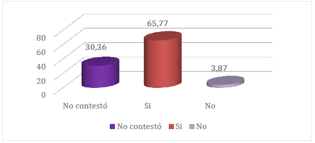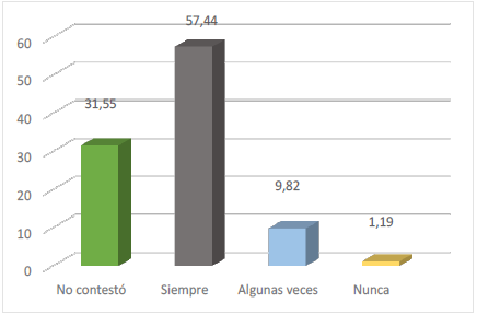 Motivación de uso. El Gráfico 6 indica que 57,4% manifiestan siempre estar motivados al uso del servicio electrónico bancario, mientras que 9,8% expresan algunas veces y nunca 1,2%. Este hallazgo resulta interesante toda vez que indica la presencia de uno de los factores que influyen en la formación de actitudes como es la motivación. No contestó, 31,6%.