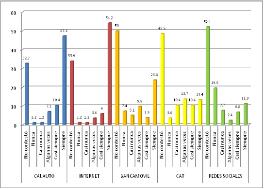 Frecuencia de uso. Esta pregunta de opción múltiple (Gráfico 5) refleja que el cajero automático (47,3%), el servicio online (54,2%) y la banca móvil (23,8%) son utilizados “siempre” por los usuarios, mientras que el centro de atención telefónica indicó un nivel de uso 13,7% para la categoría “algunas veces” y las redes sociales 19,6% para “nunca” hacen uso de estos servicios a través de redes sociales.