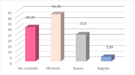 En una escala de Likert, el gráfico 7 muestra buena calificación hacia los servicios electrónicos: eficientes (42%), buenos (23,8%) y regular (3,9%). No contestó, 30,3%.