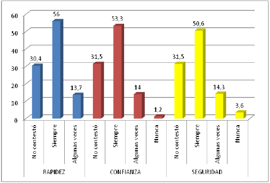 Valoración de atributos. Mediante preguntas de selección múltiple y escala de Likert (Gráfico 8), el atributo mejor valorado fue la rapidez (56%), seguido de confianza (53,3%) y seguridad (50,6%). Ello es indicativo de una predisposición favorable hacia los servicios electrónicos bancarios y no representan barreras al uso de los mismos, difiriendo de lo apuntado por Muñoz (2009).