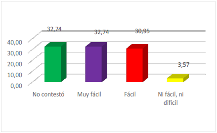 En escala de Likert, el Gráfico 9 muestra que los usuarios de los servicios encuentran muy fácil (32,74%) acceder a los mismos, un porcentaje similar (30,95%) lo cataloga de fácil y ni fácil ni difícil 3,57%. No contestó, 32,74%.