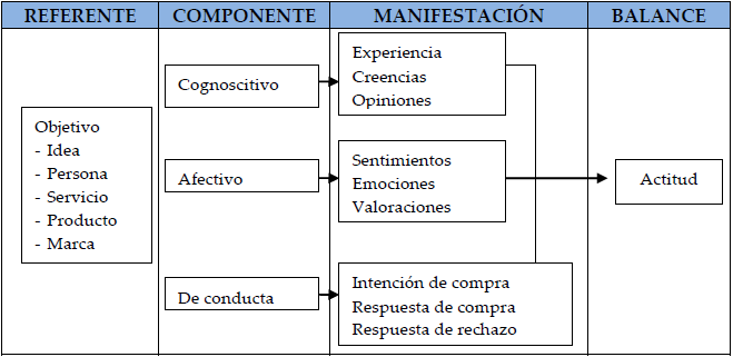 Su estructura, funcionamiento y funcionalidad puede analizarse a través de múltiples modelos (Lambin, 2005; Dubois y Rovira, 2000; Solomon, 1999), siendo uno de los más conocidos el llamado Modelo de actitudes ABC, ya enunciado por Platón, el cual parte de la premisa que la actitud está conformada por tres componentes básicos (Cuadro 1), a saber: