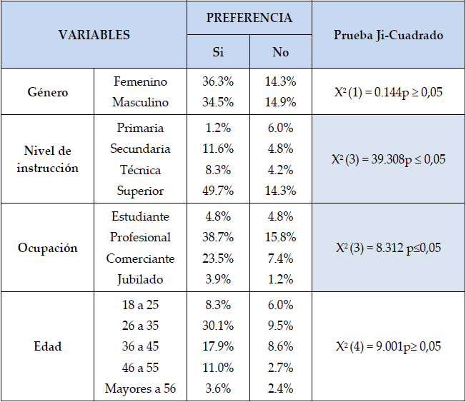 Adicionalmente, con el objeto de establecer la existencia o ausencia de relaciones (Cuadro 2) se efectuaron pruebas de independencia entre Características personales de los encuestados, vale decir, género, nivel de instrucción, ocupación y edad Vs. preferencia por los medios electrónicos bancarios. Mediante la aplicación del estadístico ji-cuadrado resultaron correlacionadas (≤ a 0,05) nivel de instrucción, ocupación vs. uso de medios electrónicos, siendo los usuarios con un nivel profesional y comerciantes, los que mayor uso hacen de los medios electrónicos. No se encontró correlación entre el sexo del usuario y el uso de medios electrónicos; tampoco con relación al género.