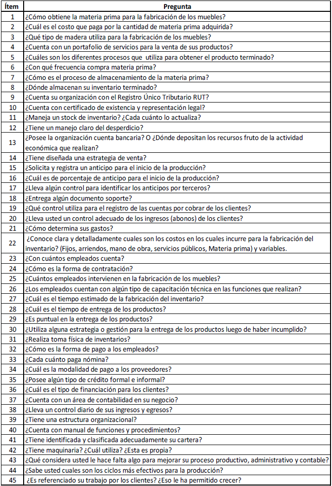 La investigación se apoyó en la técnica de la encuesta. El instrumento de recolección de datos aplicado fue un cuestionario semiestructurado, se diseñó con 45 preguntas abiertas, considerando como variables de estudio los procesos administrativos, contables y productivos de las microempresas dedicadas a la fabricación de muebles en madera de Quibdó. El grupo de informantes claves estuvo integrado por los propietarios de las microempresas de Quibdó destinadas a confeccionar muebles en madera. La validez del cuestionario se alcanzó con la revisión de tres expertos, el primero vinculado con el área de contenido, específicamente en el área de gerencia y contabilidad, el segundo está relacionado al campo de la metodología y, el tercero es afín al área de lengua y redacción.