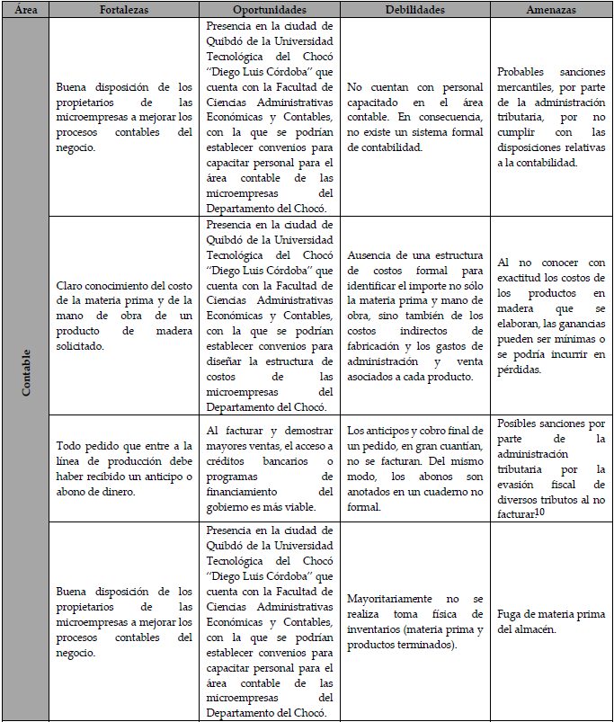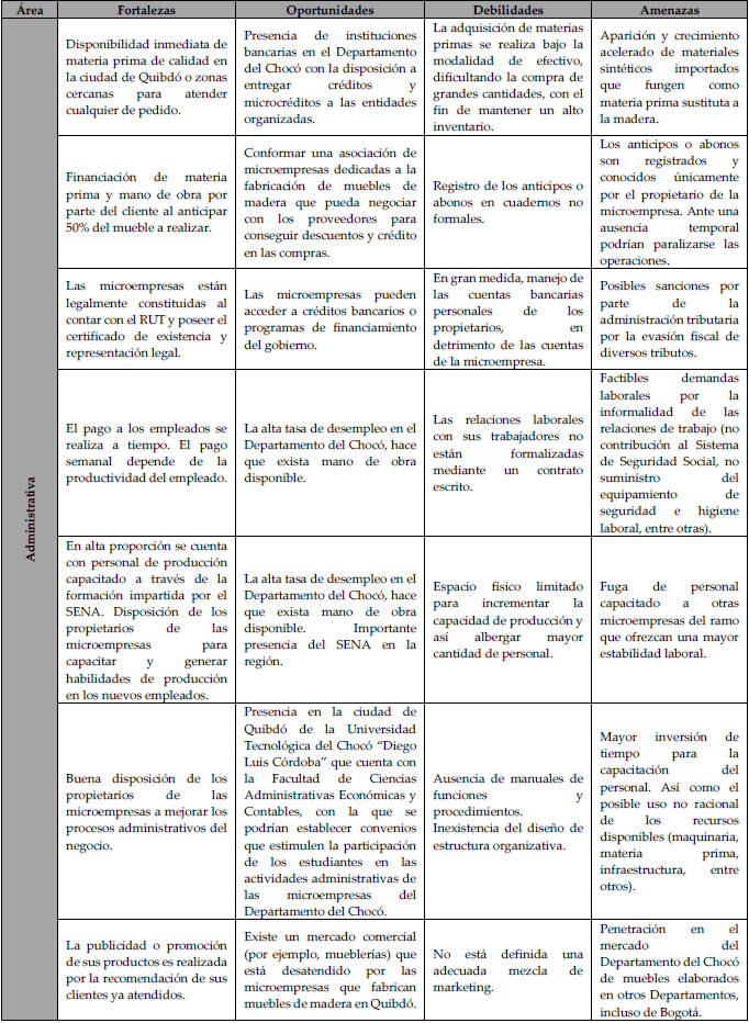 Como paso previo al diseño de las estrategias encaminadas a fortalecer los procesos administrativos, contables y productivos de las microempresas dedicadas a la fabricación de muebles de madera en Quibdó, se elaboró una matriz FODA por área, herramienta que permite precisar la situación real (tanto interna como externa) del objeto de estudio abordado.