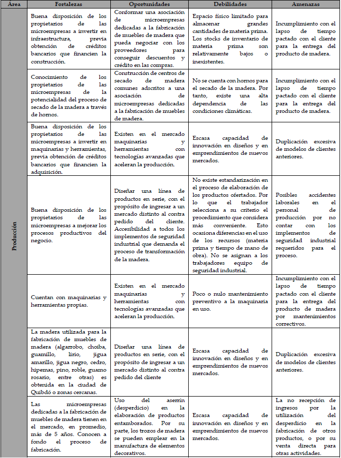 A continuación se presenta una matriz FODA para cada proceso que se pretende fortalecer en la microempresa que elabora muebles de madera.