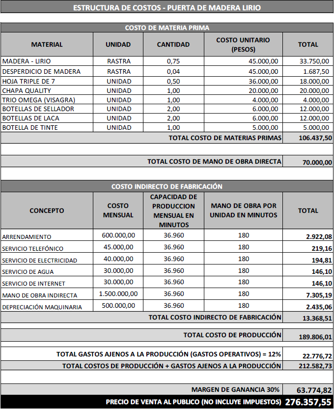 La estructura de costos que se ilustra en el ejemplo corresponde a una puerta de madera de lirio.
