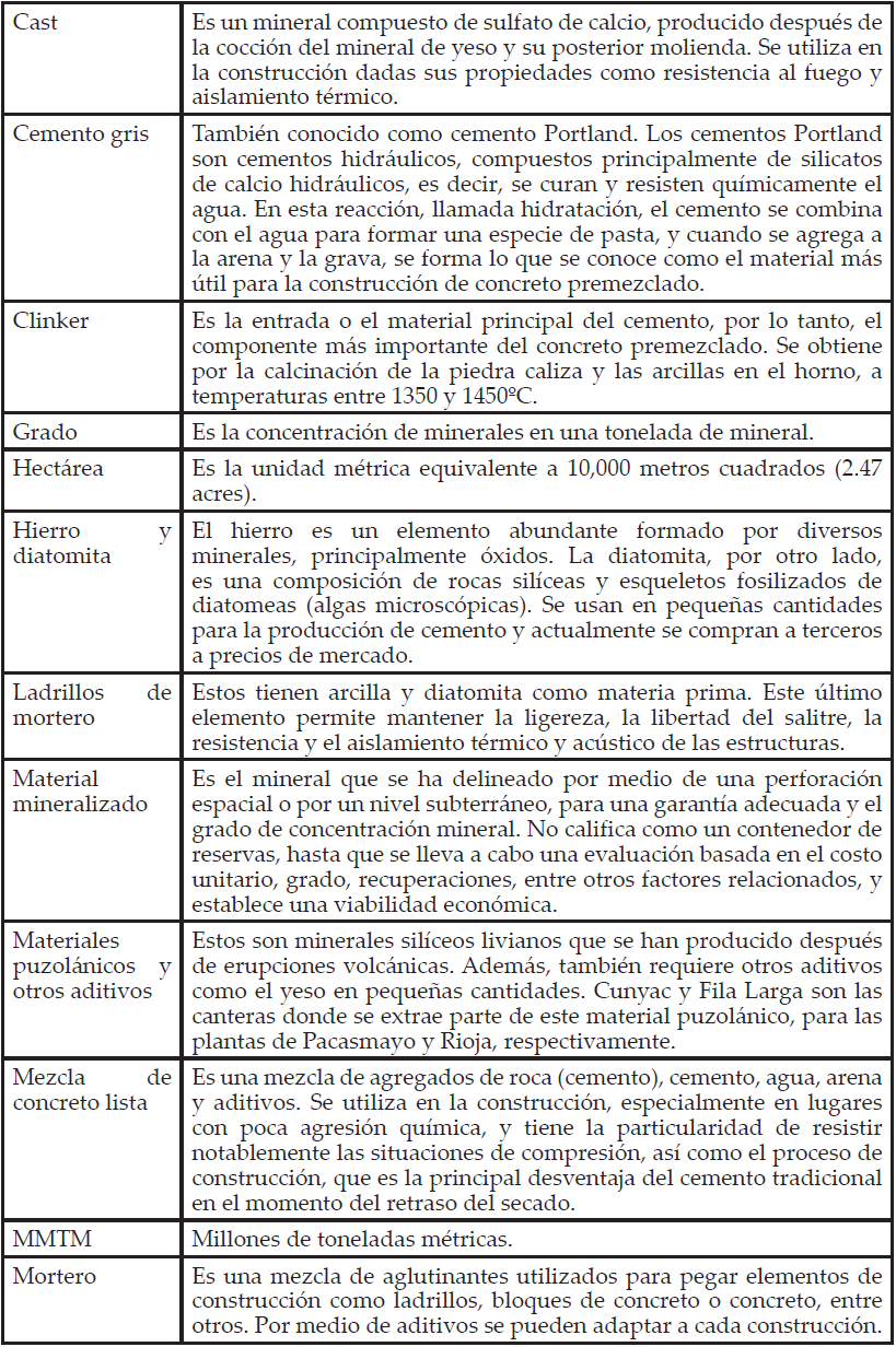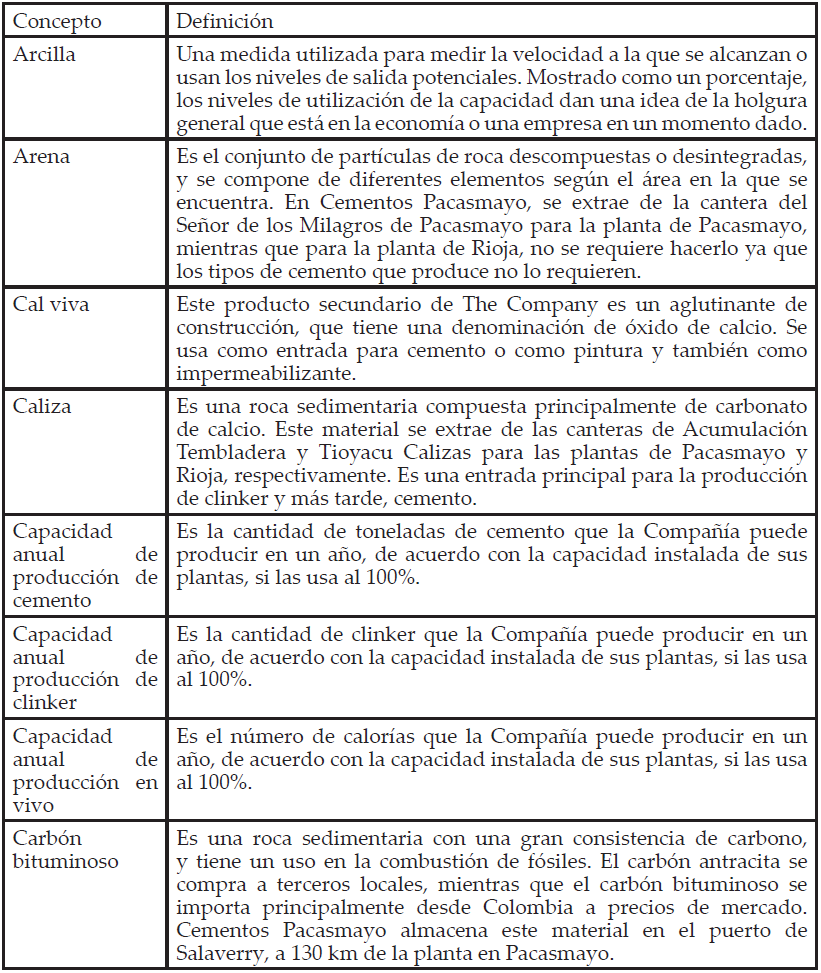 Cementos Pacasmayo S.A.A. Glosario. Recuperado de http://investors.cementospacasmayo.com.pe/cementospacasmayo/web/conteudo_es.asp?idioma=2&conta=47&tipo=42146