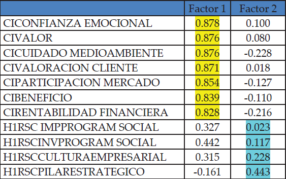 En la comprobación del sesgo, se utiliza el test del factor único de Harman, en donde, se introducen las variables independientes en un solo factor. Según Podsakoff y Organ (1986) y Doty y Glick (1998), si todas las variables tienden a acercarse a un factor único o los factores explican que las varianzas son mayores, da referencia a que el sesgo se basa en el método común. Ademas de esto, Diamantopoulos y Whinklhofer, 2001, demuestran la premisa anterior. En la tabla 7 se presentan las varianzas de los factores y se demuestra que el sesgo mencionado no presenta complicaciones a la metodología (Podsakoff y Organ, 1986; Podsakoff et al., 2003). Utilizando el criterio de eigenvalue no menor que uno, se generan dos factores, cada uno de los cuales explica, respectivamente, el 36,674% y 20,184% de la varianza, que en suma total se muestra un valor del 56.858% (como no se llega a la unidad se concluye que el sesgo no es significativo para la metodología).