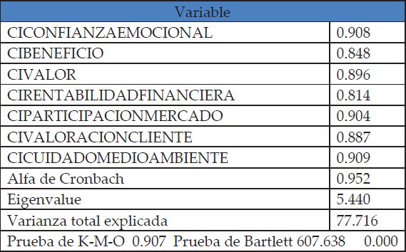 Para realizar el análisis factorial de la confianza del inversor se utilizaron las variables mencionadas en el cuadro 3. Con el calculó del Alpha de Cronbach se pudo obtener una consistencia interna de 0.952. Considerando el análisis factorial y el Alpha de Cronbach se probó la validez del conjunto de variables de la confianza del inversor (CI) con un factor de 77,716% de la varianza de los ítems.