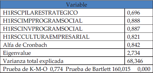 Para realizar el análisis factorial de las acciones estratégicas de RSC que el banco realiza, se han utilizado las dimensiones analizadas como se muestra en el cuadro 4. Al realizar el cálculo del Alpha de Cronbach se estableció una consistencia interna de 0,842. Con ambos métodos se logró la validez del conjunto de variables de acciones estrategias (ACCIONESESTRATEGRSC) con un factor de 68,346% de la varianza de los ítems.
