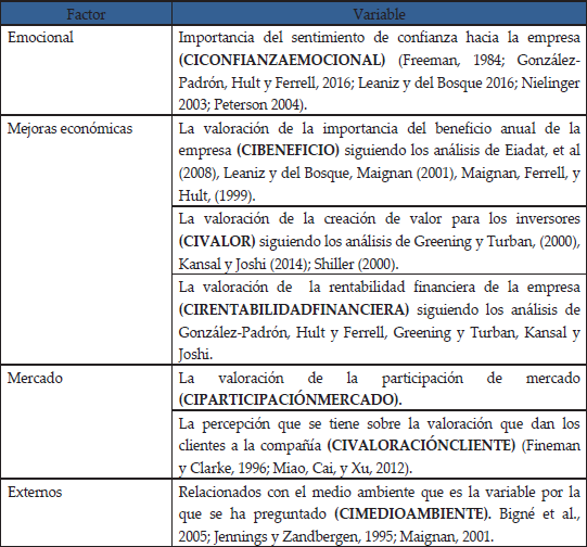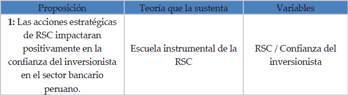 Este modelo de investigación está sustentado en la teoría de la Responsabilidad Social Corporativa (RSC), y con esta se formuló la siguiente proposición presentada en el cuadro 1.