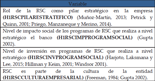 Finalmente, se encuentra que los autores Caroll (1979), Gupta (2002) y Windsor (2001) hacen referencia a la validación de la hipótesis con la necesidad de las estrategias de RSC como una tarea de internalización para la empresa, lo cual, tendrá un impacto positivo de forma interna y externa (confianza inversor). Además, los estudios del sector bancario mencionan que las acciones estratégicas en los bancos han tomado mayor importancia (King y Levine, 1993; Prior y Argandona, 2008).