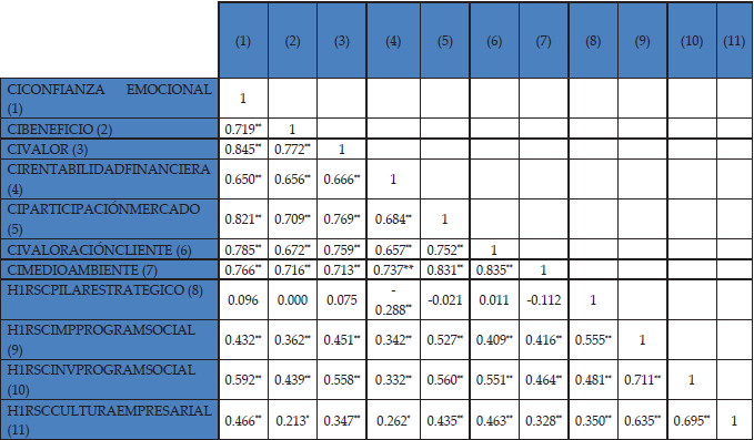En resumen, para evaluar la hipótesis planteada es necesario considerar el conjunto de CI como variable dependiente, la cual, explica 77,716% de la varianza de los ítems del cuestionario. Además, se utilizó como variable independiente el conjunto de las acciones estratégicas RSC (ACCIONESESTRATEGRSC), el cual, explica 68,346% de la varianza de los ítems del cuestionario. En el cuadro 11 se muestran los resultados de la regresión que prueba la hipótesis planteada, previamente deducida.