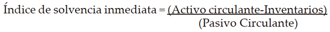 La solvencia de un ente económico se mide a través de varios índices, el más preciso es el índice de solvencia inmediata, porque no considera el inventario de productos, pues pueden hacerse líquidos hasta que se vendan (Herrera-Freyre, Betancourt- Gonzaga, Herrera-Freyre, Vega-Rodríguez y Vivanco-Granda, 2016). Esta razón financiera toma como base la información emanada del balance general y su fórmula es (Ochoa-Setzer, 2002):